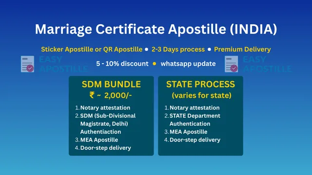Apostille your Indian marriage certificate for Hague countries—choose Sticker (physical) or e-Apostille (QR). Simple fees, required documents, 2–3 day timelines, pickup, tracking, and secure return.