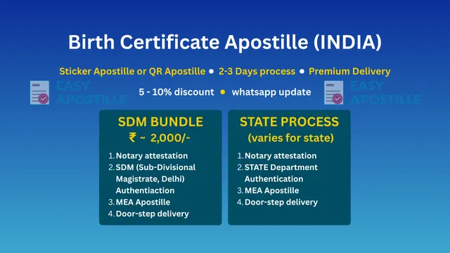 Includes Notary + SDM (Delhi) + MEA apostille + premium pickup/return with WhatsApp/email updates.